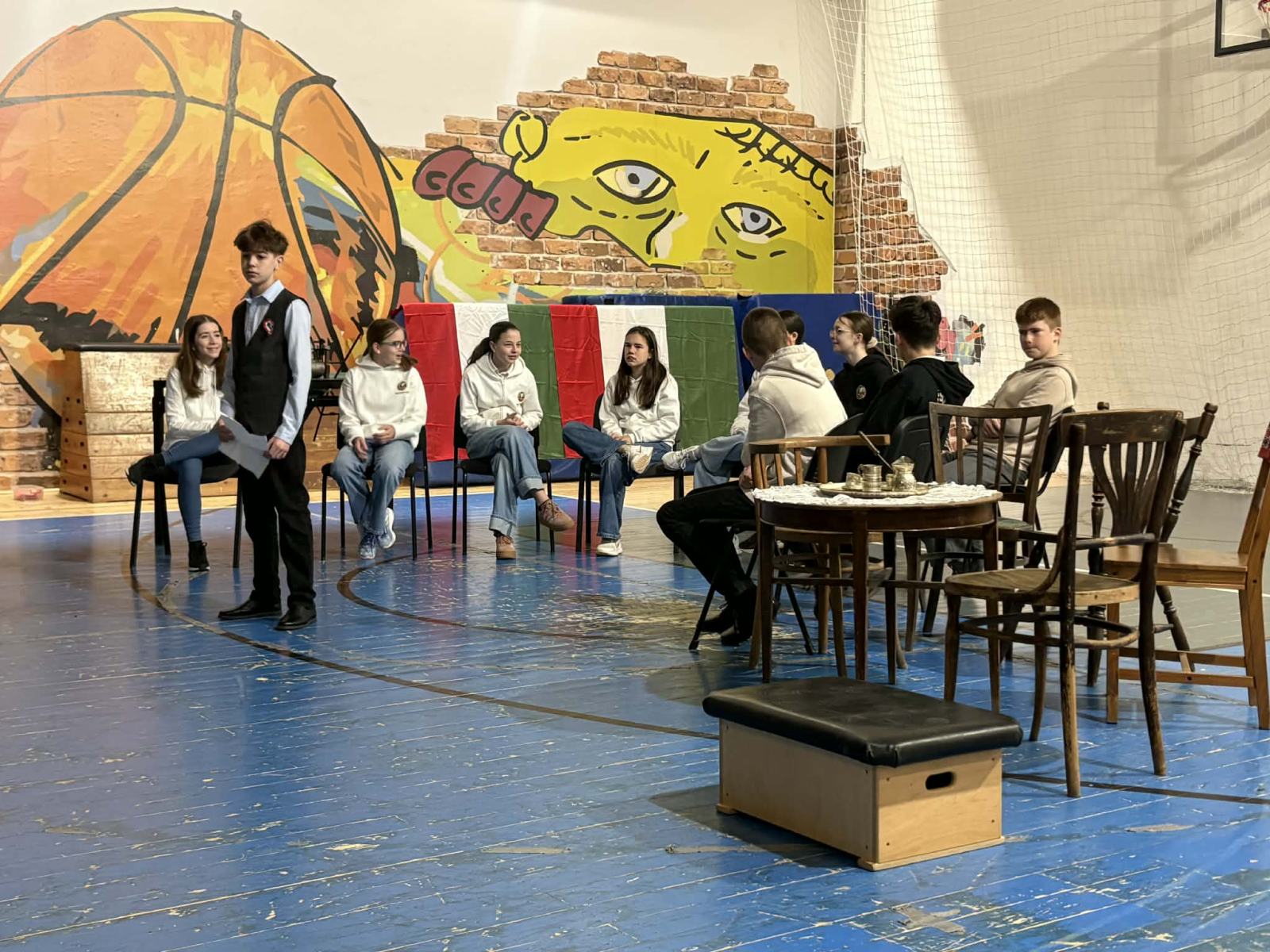 Március 15-i műsorunkat idén is a 7. osztályos tanulók szervezték. Ez alkalommal a szereplők és a közönség egy időutazás keretein belül élhették át az 1848. március 15-i eseményeket.